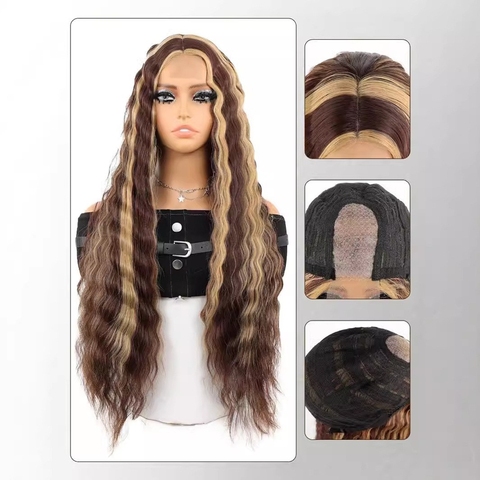 Đầy Màu sắc tóc vàng 13*6 diện tích lớn ren tóc giả tổng hợp sợi tương lai dài tự nhiên lớp dẻo dai sóng hỗn hợp màu sắc mật độ cao